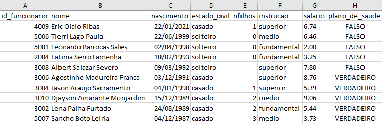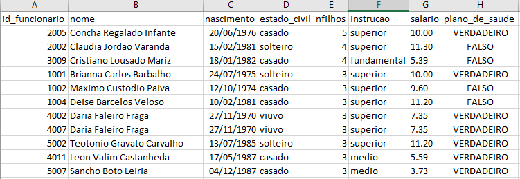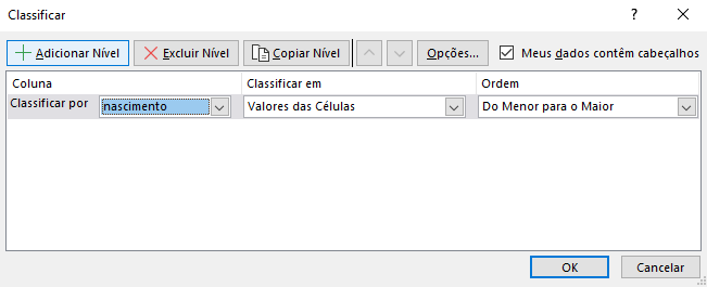 No exemplo abaixo, a tabela está sendo ordenada pela coluna nascimento em ordem crescente (a figura mostra apenas o início da tabela).