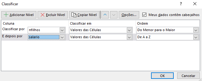 Ainda podemos utilizar várias colunas na ordenação. O exemplo abaixo ordena a tabela de forma decrescente , primeiro por nfilhos e depois crescente por salario. Use a opção “Adicione Nível” para acrescentar outras variáveis, A Figura abaixo mostra as etapas de opções que devemos selecionar.