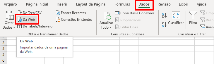 Como o arquivo que iremos trabalhar está disponível na web, precisamos selecionar “Dados” e depois “da Web”.
