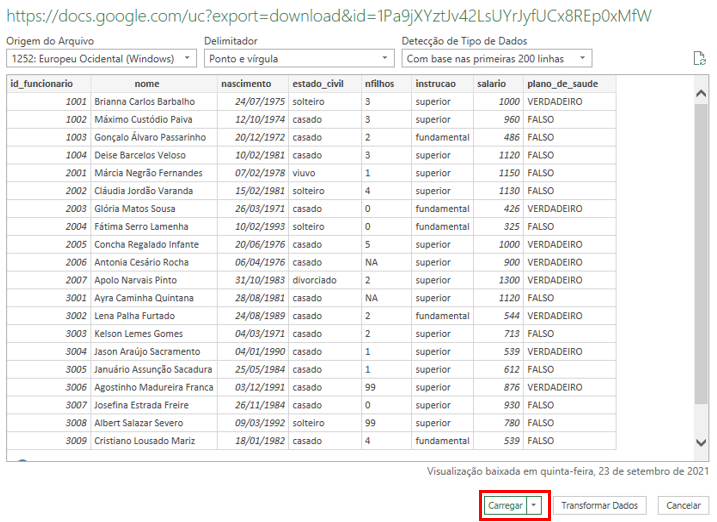 A próxima etapa é escolher o delimitador, mantenha como “Ponto e vírgula” e clique em carregar. Em alguns casos será preciso escolher outro delimitador como por exemplo a vírgula, o espaço ou tabulação para que os dados fiquem estruturados. Esta escolha depende de como estão os dados no local de origem.
