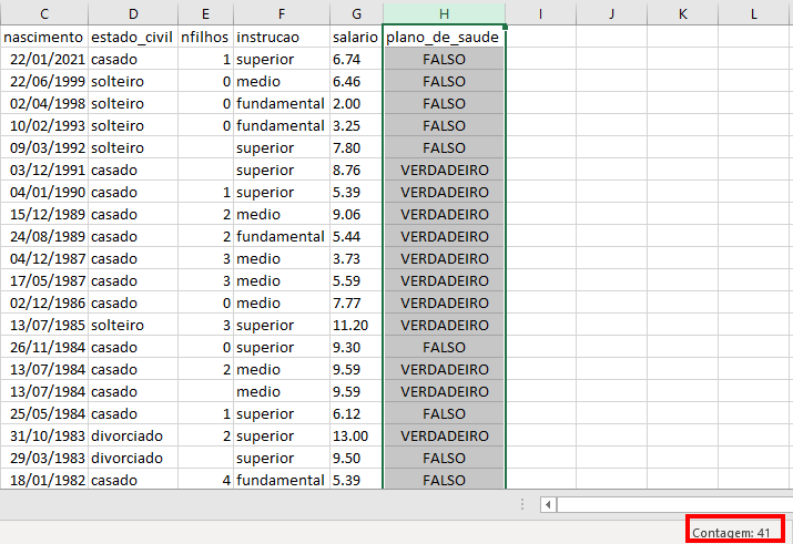 Dimensão da tabela: Para conferir o número de linhas da tabela basta selecionar uma das colunas e verificar na barra inferior à direita. O Excel mostra a contagem de linhas incluindo a que contém o nome das variáveis. O mesmo processo pode ser usado para verificar o número de linhas. Para visualizar uma variável ou uma linha selecioná-las facilitará encontrar as informações.