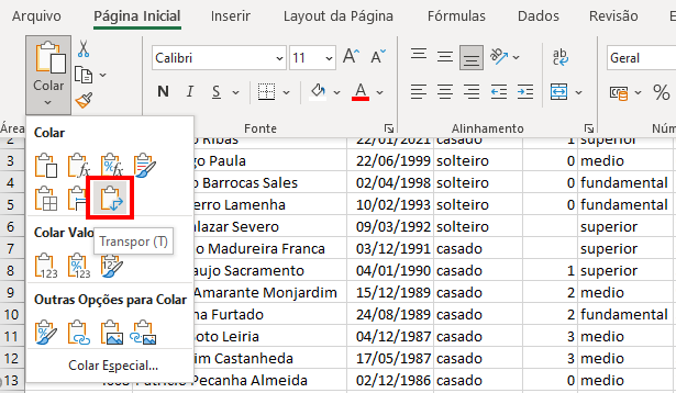 Nomes das variáveis Para criar uma lista com os nomes das variáveis selecione todas as células da primeira linha, copie e cole em outra aba. Entretanto, aqui utiliza-se o colar transpor.
