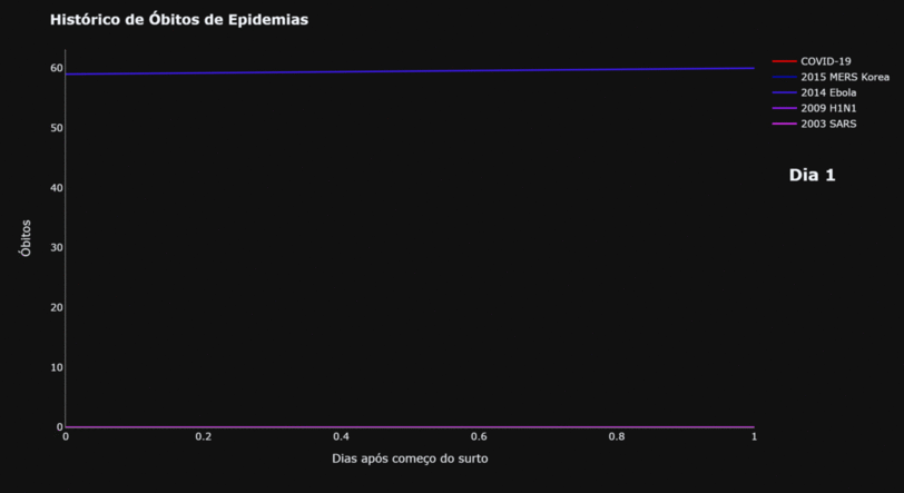 Para responder a essas perguntas, vamos observar uma animação da evolução dessas 5 epidemias ao longo do tempo, analisando o número de casos e de óbitos de cada uma ao longo do tempo transcorrido desde o início de cada surto.